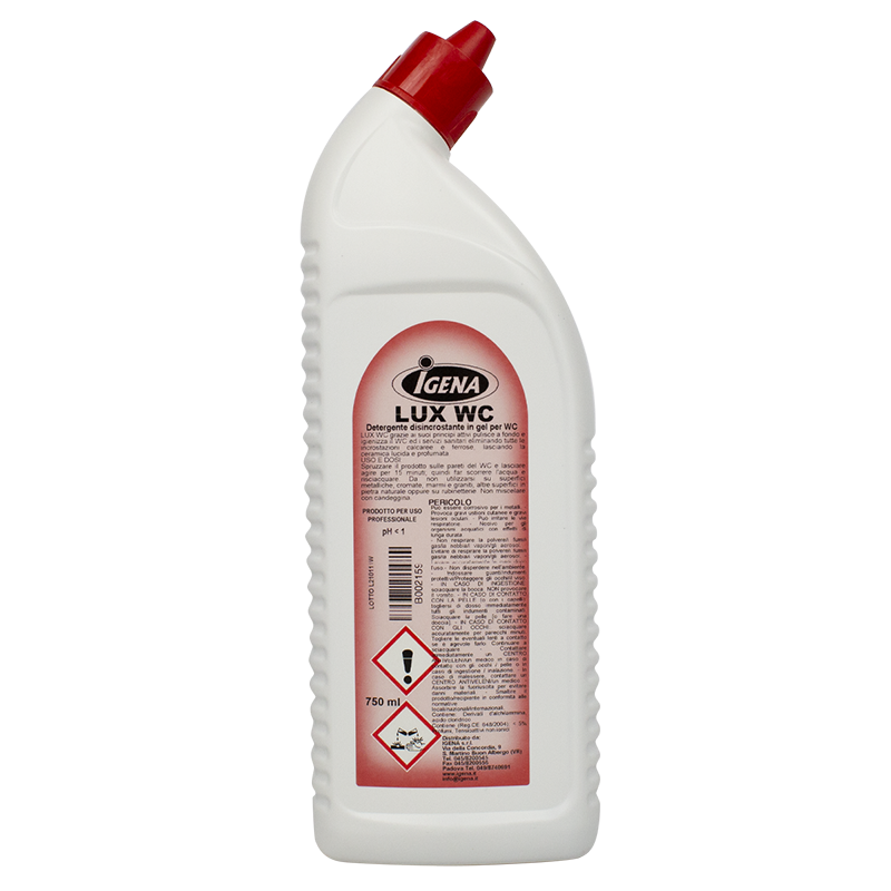 DETERGENTE LUX WC: Detergente disincrostante profumato per la pulizia del WC. La particolare viscosità e il dispositivo "collo inclinato" permettono di raggiungere facilmente tutte le parti nascoste del WC. Vedi dettagli
