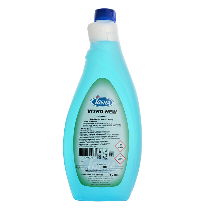 DETERGENTE VITRO NEW: Detergente pronto all'uso ad effetto brillantante ed antistatico specifico per la pulizia di vetri, cristalli, specchi, video ed LCD. Vedi dettagli
