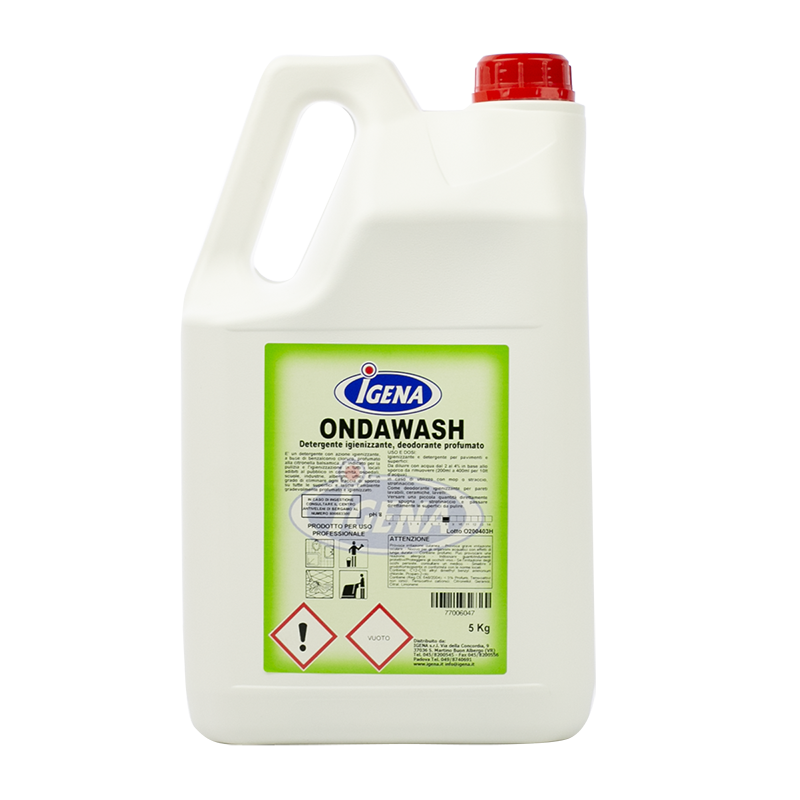 Disinfettanti pavimenti ONDA WASH: Detergente con azione sanizzante, a base di benzalconio cloruro, profumato alla citronella balsamica. Vedi dettagli