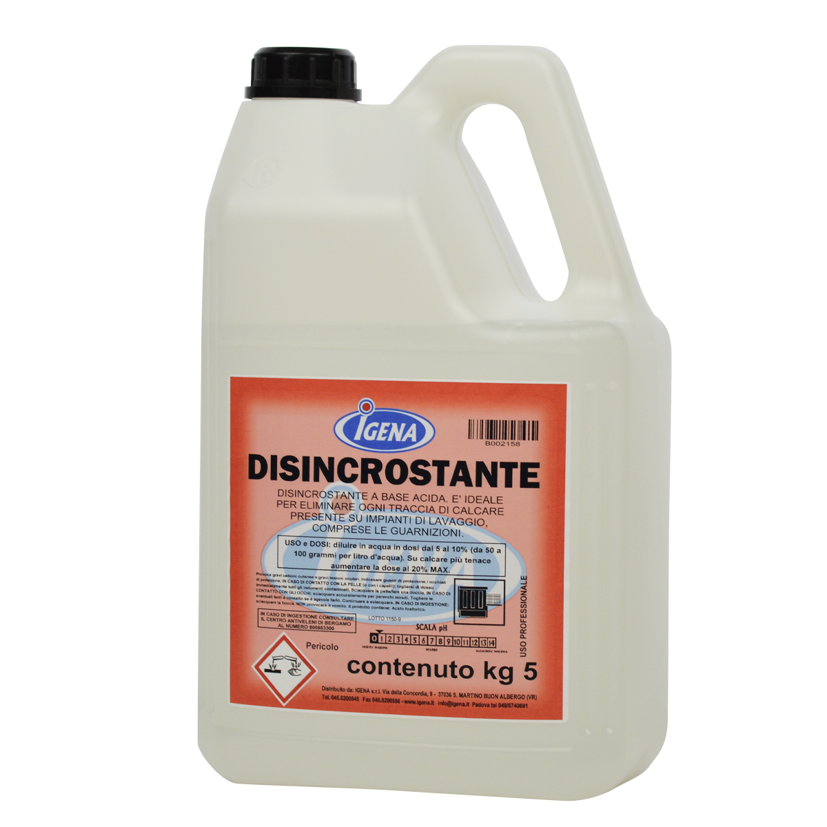 Disincrostante liquido a base acida, di facile utilizzo, particolarmente indicato per la periodica pulizia di attrezzi in acciaio, vetro, pentolame, posateria, impianti di lavaggio meccanici. Decalcifica in modo rapido e sicuro e, grazie alla presenza di particolari inibitori di corrosione, non intacca i metalli e i macchinari in genere. Non contiene acido cloridrico.