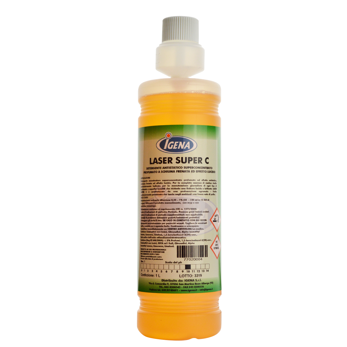 Detergente manutentore superconcentrato profumato ad effetto antistatico, schiuma frenata ed effetto lucido. Per la completa assenza di residuo risulta particolarmente indicato per la manutenzione giornaliera di ogni tipo di pavimento e superfici lavabili che richieda una finitura lucida e brillante. LASER SUPER C è caratterizzato da una profumazione agrumata – fiorita particolarmente persistente che lascia negli ambienti una fresca nota di pulito