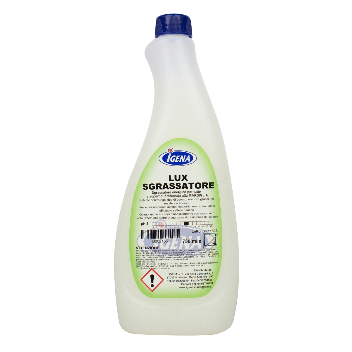 Detergente sgrassante al profumo di marsiglia, ideale per la rimozione di grassi, olii, morchie e residui carboniosi da qualsiasi superficie lavabile. Indicato per pulire a fondo piani da lavoro, attrezzature varie presenti in cucina, pareti lavabili, cappe, ecc.