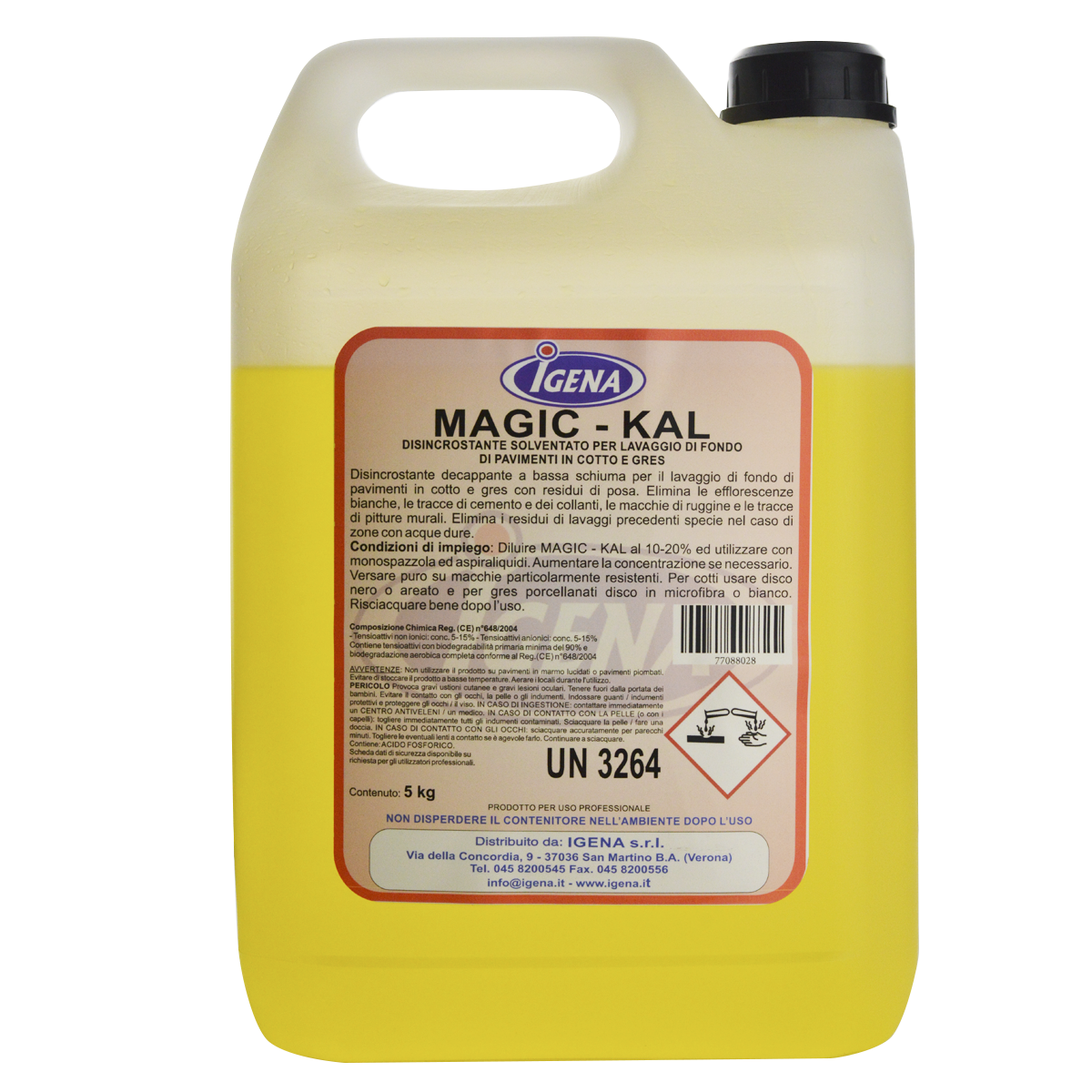 Diluire MAGIC - KAL al 10-20% ed utilizzare con monospazzola ed aspiraliquidi. Aumentare la concentrazione se necessario.