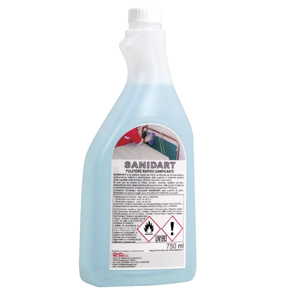 SANIDART è un disinfettante pulitore  rapido  senza  risciacquo per la disinfezione, pulizia,  smacchiatura e  spolveratura delle  superfici in ambiente comunitario e sanitario, quali scuole, case di riposo, ospedali, cliniche, laboratori, studi medici, nonché  per disinfettare e pulire le superfici di Camere Bianche e Grigie. Contiene Clorexidina e Quaternari in soluzione idroalcolica per  un'azione disinfettante  rapida. Si usa per la disinfezione e pulizia di superfici lavabili nelle camere di degenza e nei locali di  servizio. Può essere inoltre utilizzato anche nell’industria alimentare e nella ristorazione.  I componenti sono presenti nella lista delle sostanze ammesse dalla legislazione francese per uso su superfici in contatto con sostanze alimentari (Arreté 8 Sept. 1999).
